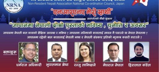 जापान, माघ ४ । गैर आवसिय नेपाली संघ रा स प जापानको एउटा सु सुचित गराउने अभियान NRNA मेरो साथी अन्तर्गतको आगामी चौथो श्रिङ्खलामा बिभिन्न उदेश्यले जापानमा बसोबास गर्दै आउनु भएका बाबु आमाले आफ्नो सन्तानको भबिष्यलाई लिएर देखाउनु भएको चिन्ताको बिषयलाई मध्य नजर गर्दै सोही बिषयमा बिशेष अनुभब बटुल्नु भएका ब्यक्तिहरुको अनुभब सहित बिशेष कार्यक्रम … Continue reading एनआरएनए मेरो साथी अन्तर्गतको चौथो श्रृखला यहि जनवरी २२ तारिक, भिजन अनलाईन न्युजबाट प्रत्यक्ष प्रसारण हुने