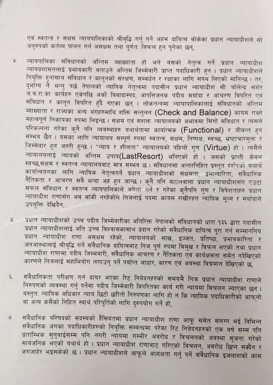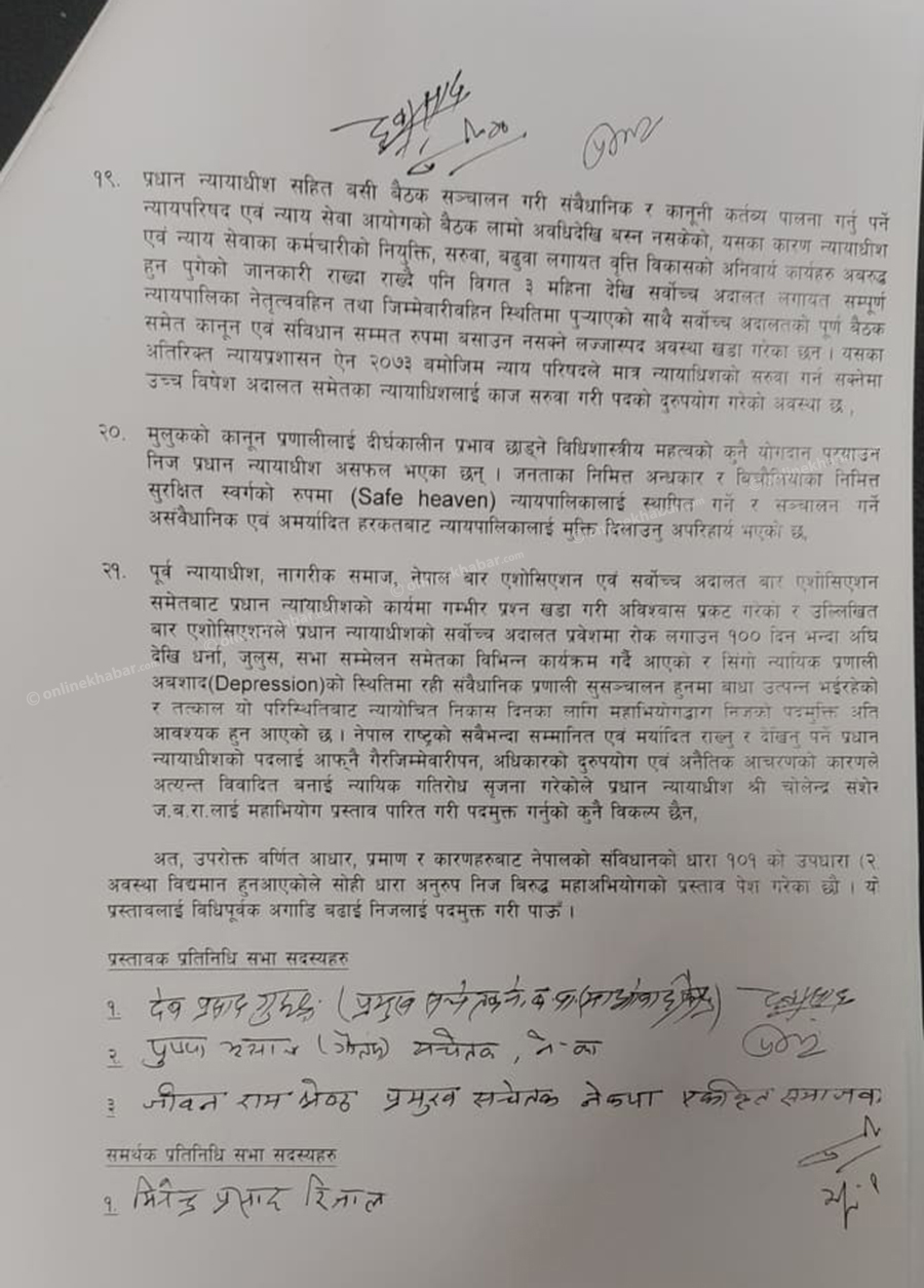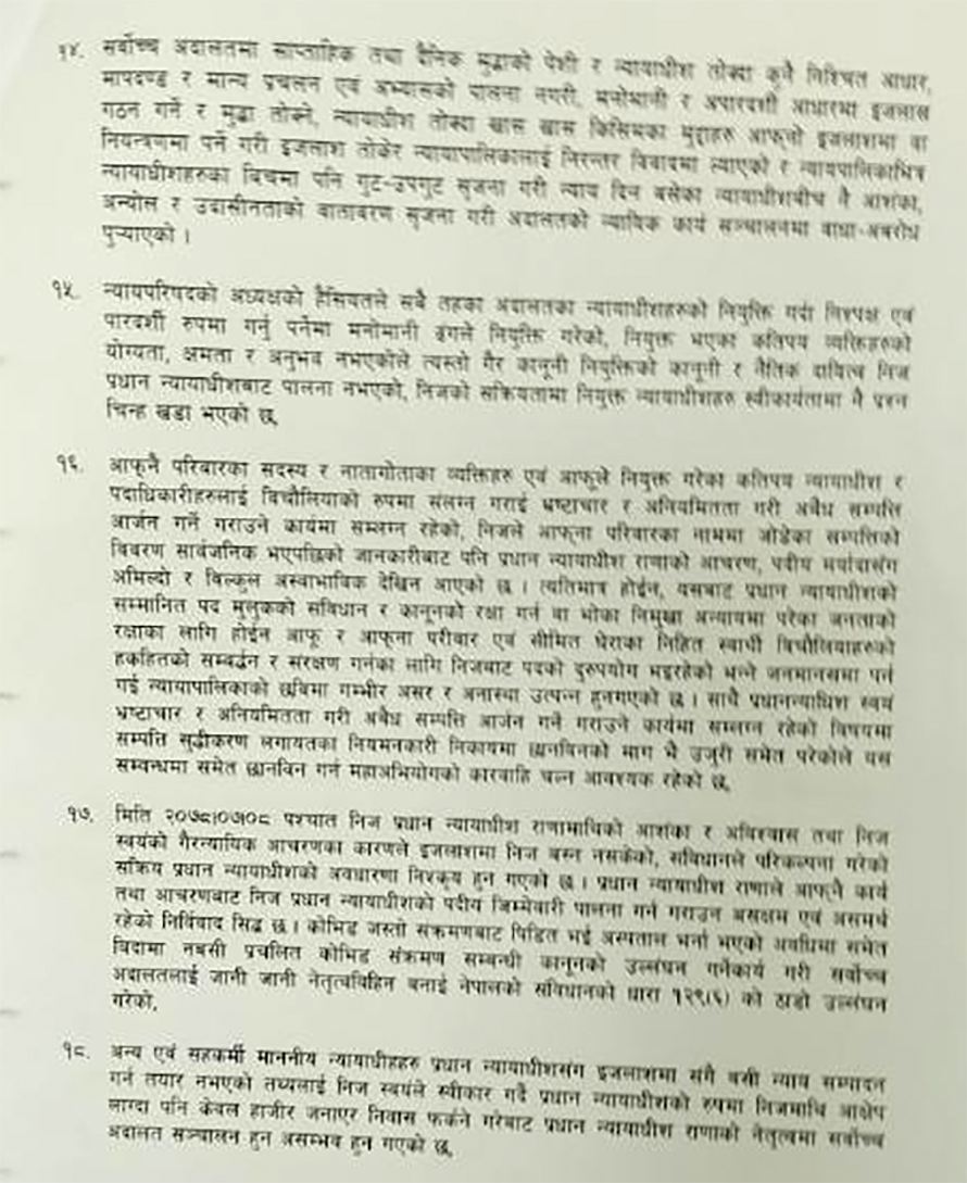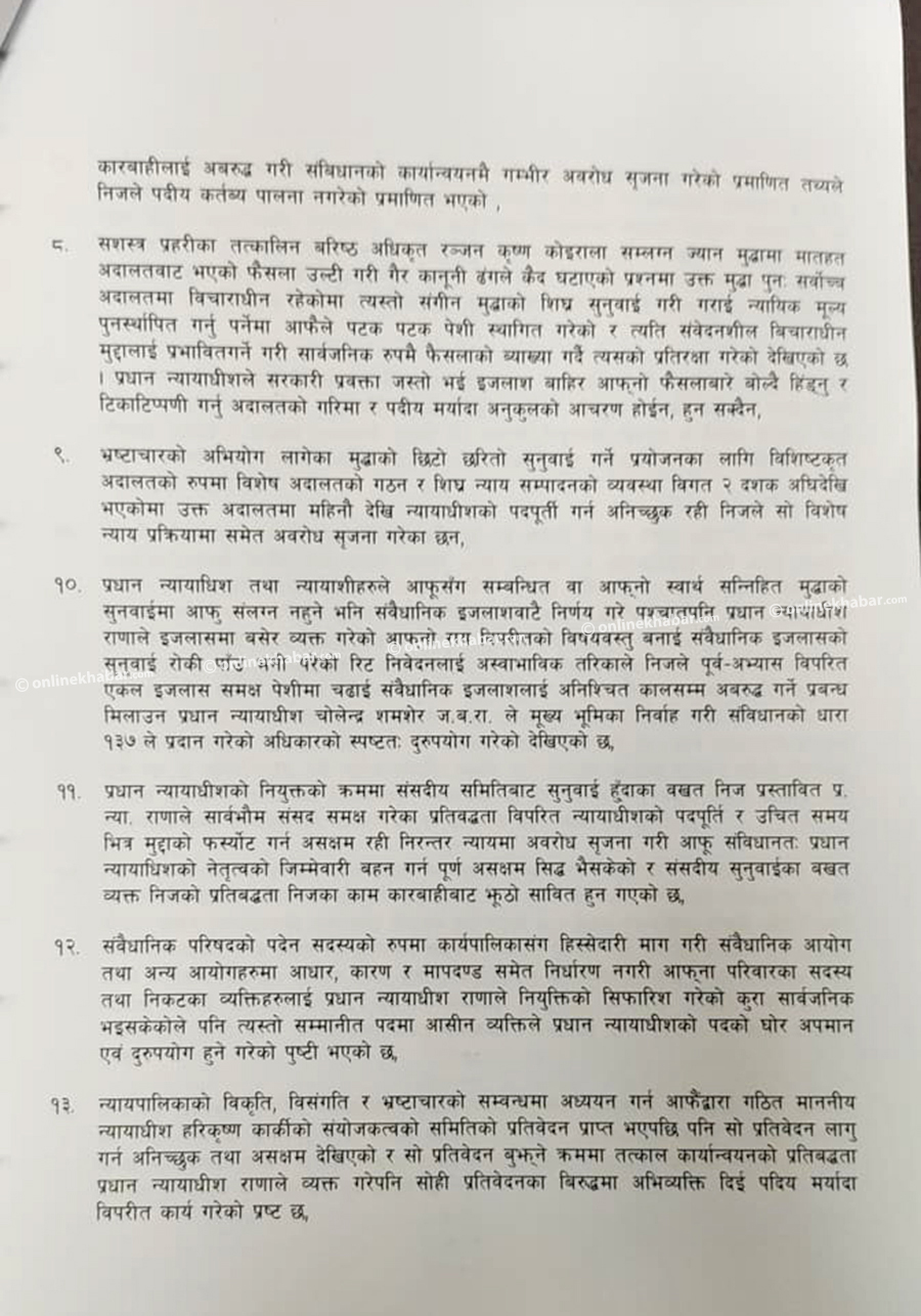यसैगरी सर्वोच्च अदालत लगायत न्यायापालिकाभित्र नै उनको कार्यकालमा अतिशय विकृति, विसंगती, भ्रष्टाचार तथा विचौलियाहरुले प्रवेश पाएको र प्रभाव बढाउँदै लगेको महाअभियोग प्रस्तावमा उल्लेख छ ।
