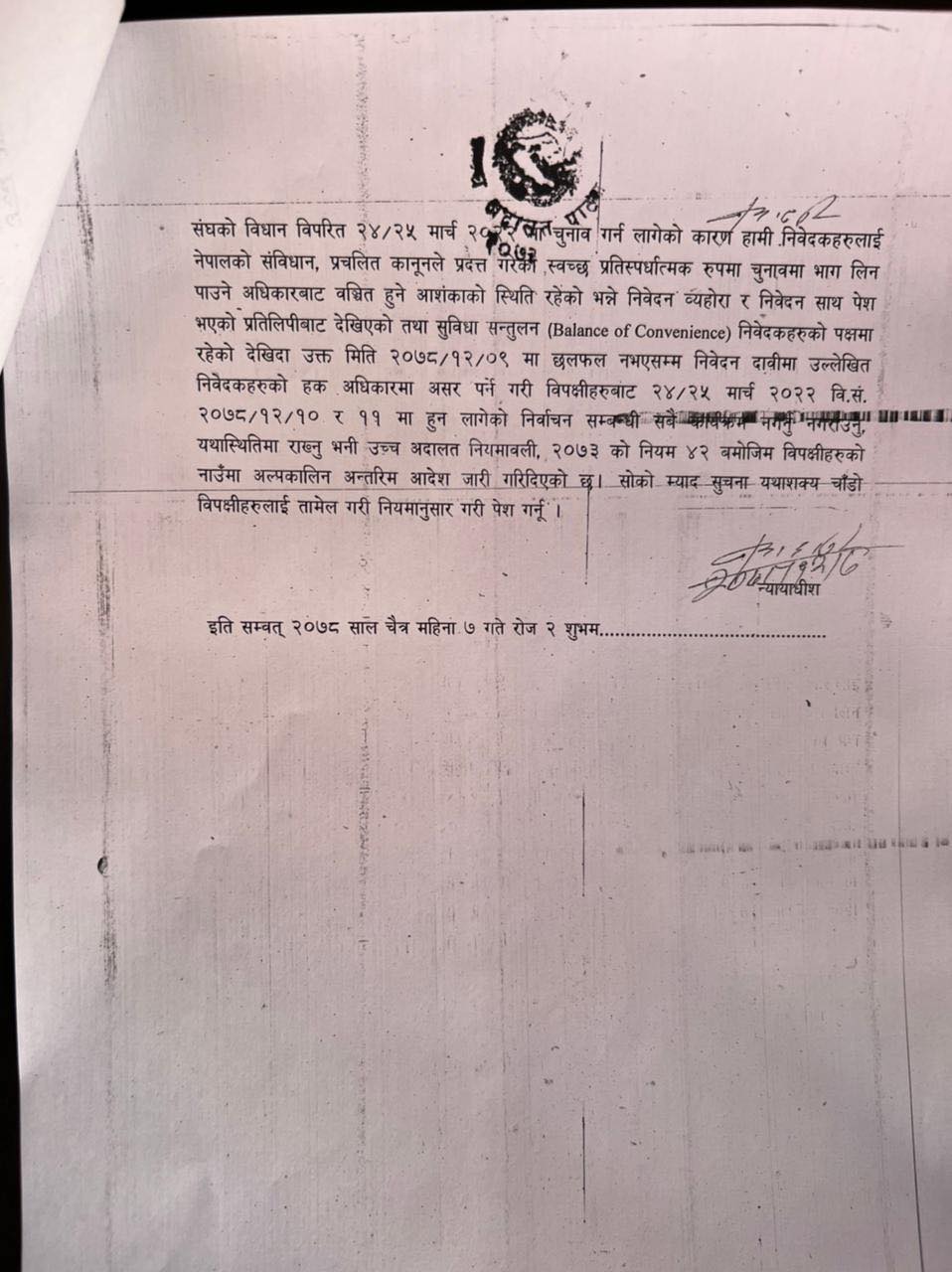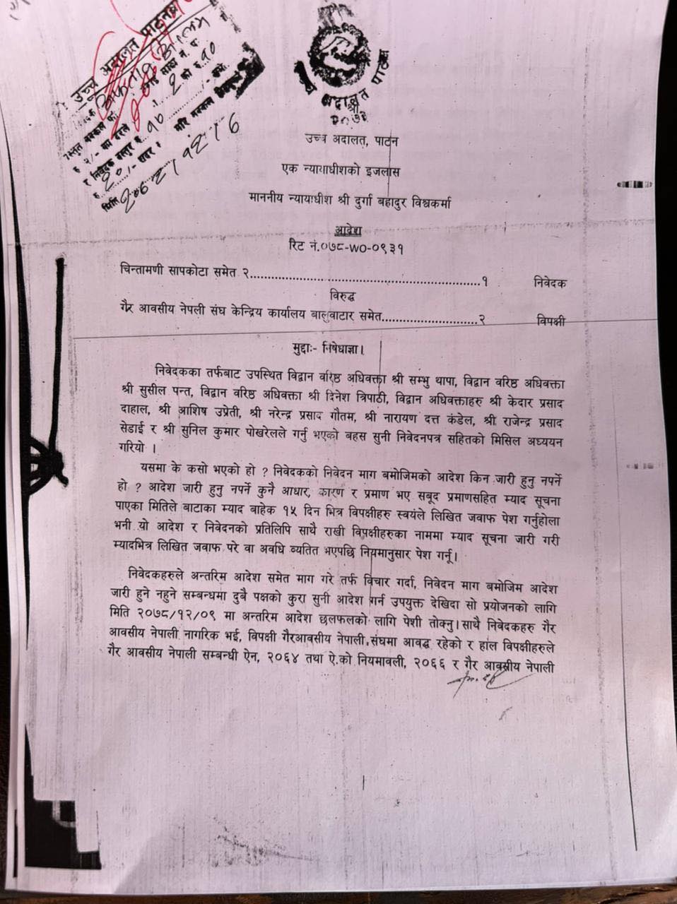 एनआरएनएन निर्वाचन मतदाता नामावलीप्रति असंतुष्ट जनाउँदै चिन्तामणि सापकोटा र उमेश कुमार पुडासैनीले दायर गरेको रिट निवेदन माथि प्रारम्भिक बहस गर्दै उक्त आदेश दिइएको हो।