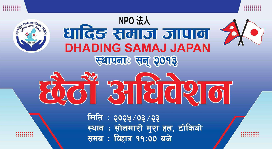 यहि मार्च २३ तारिख अथवा चैत्र १० गते आज जापानको टोकियोमा आयोजना हुने धादिङ समाज जापानको छैटौँ अधिवेशनको तयारी पुरा भएको बताईएको छ। समाजका अध्यक्ष श्यामहरि तिम्सिनाका अनुसार अधिवेशनमा, जापानका लागि नेपाली राजदुत डा. दुर्गा बहादुर सुवेदीको प्रमुख आतिथ्यता रहनेछ।