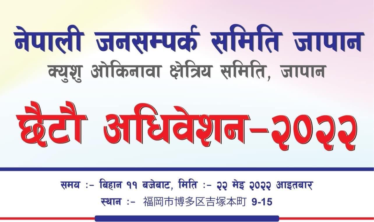 लोकतन्त्र मा आस्था राख्ने प्रवासी नेपालीहरुको आस्थाको धरोहर, नेपाली कांग्रेसको प्रवास स्थित शुभेच्छु संस्था नेपाली जनसम्पर्क समिति जापानको क्युशु क्षेत्रको क्षेत्रिय अधिवेशन को मिति तय भएको छ। क्युशु क्षेत्रिय समितिको गत २४ एप्रिल २०२२ मा बसेको क्षेत्रिय कार्यसमितिको मिटिंगले सर्वसम्मत यो निर्णय गरेको कार्यसमिति का सचिव मदन शर्माले जानकारी दिनुभयो। क्युशु क्षेत्रको छैटौँ अधिवेशन तय गर्नभनी राखिएको मिटिंगले जनसम्पर्क समिति जापान केन्द्रले पठाएको अधिवेशन सम्बन्धी पत्रका आधारमा क्युशु क्षेत्रले यो निर्णय गरेको र संस्था ले विधिवत रुपमा नेपाली जनसम्पर्क समितिको संशोधित विधान २०२१ लाइ अक्षरांश पालना गर्दै विधी,विधान र पद्वतीलाइ मूल मन्त्र मानेर छैटौँ अधिवेशन सम्पन्न गर्नेछ’ उप-सभापति सुरज बनले भन्नुभयो।