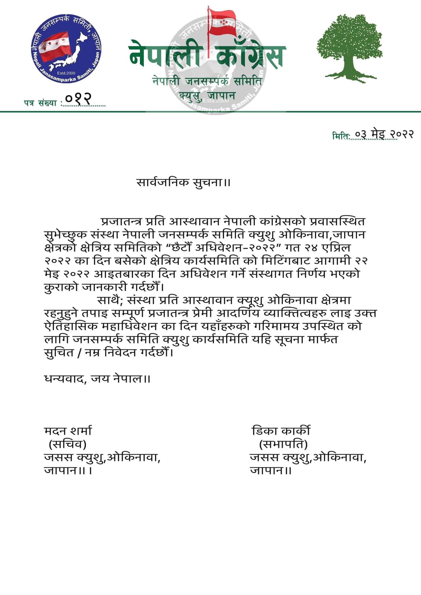 “क्युशु क्षेत्र तथा जापानका सबै ठाउँहरुमा छरिएर बस्नुभएका समस्त आस्थावान शुभेच्छु नेता तथा साथीहरुलाइ क्युशु क्षेत्रिय समितिको छैटौँ अधिवेशन मा उपस्थित भइ कार्यक्रमलाइ भव्य र सभ्या बनाइदिन अनुरोध सहितको सार्वजनिक निमन्त्रणा को निवेदन गर्दछु”- सभापति डिका कार्कीले भन्नुभयो।