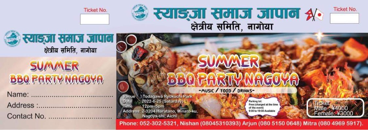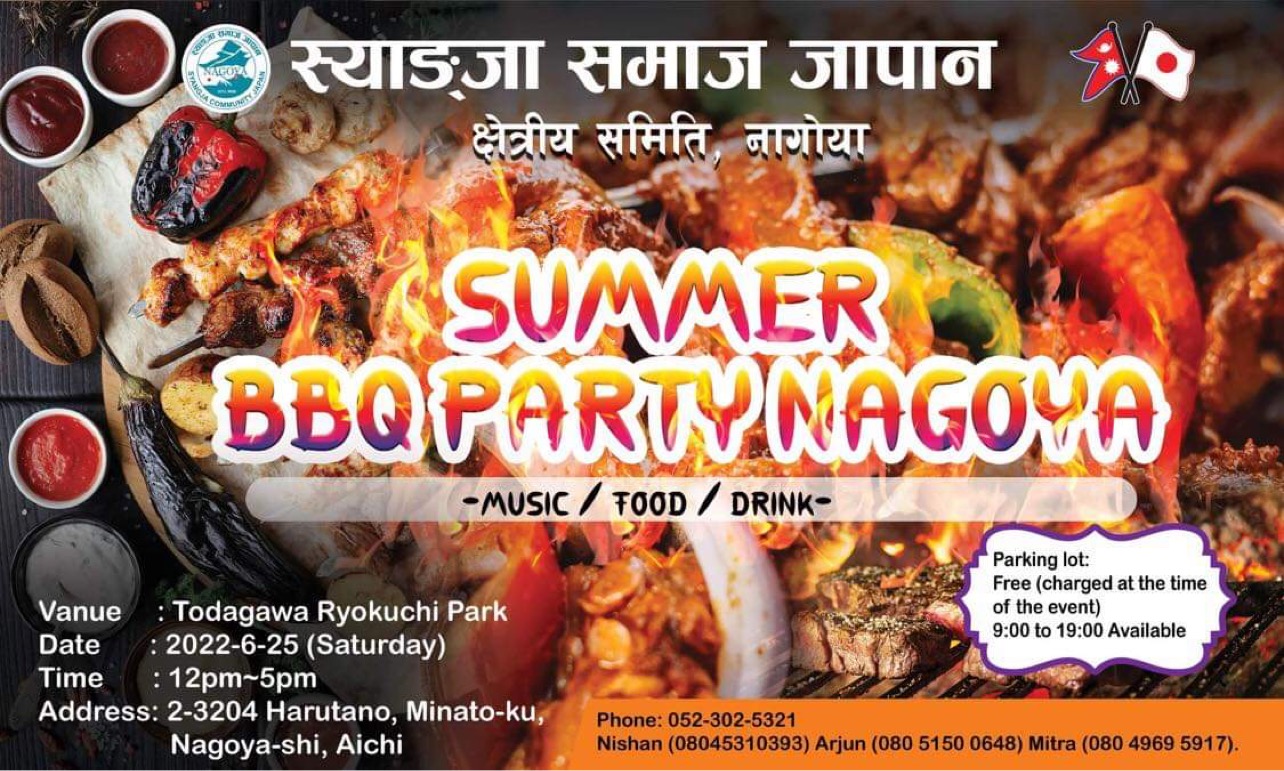 विश्व महामारीले गर्दा लामो समयदेखी सामूहिक भेंटघाट नभएको र नेपाली भाईचारालाई अझ प्रगाढ बनाउन स्याङ्जा समाज जापान क्षेत्रीय समिति नागोयाको आयोजनामा जुन महिनाको २५ तारिक शनिवार नागोया स्थित todagawa ryokuchi पार्कमा बिबिक्यु तथा बृहत बनभोज कार्यक्रम गर्न लागेको आयोजकले बताएका छन ।