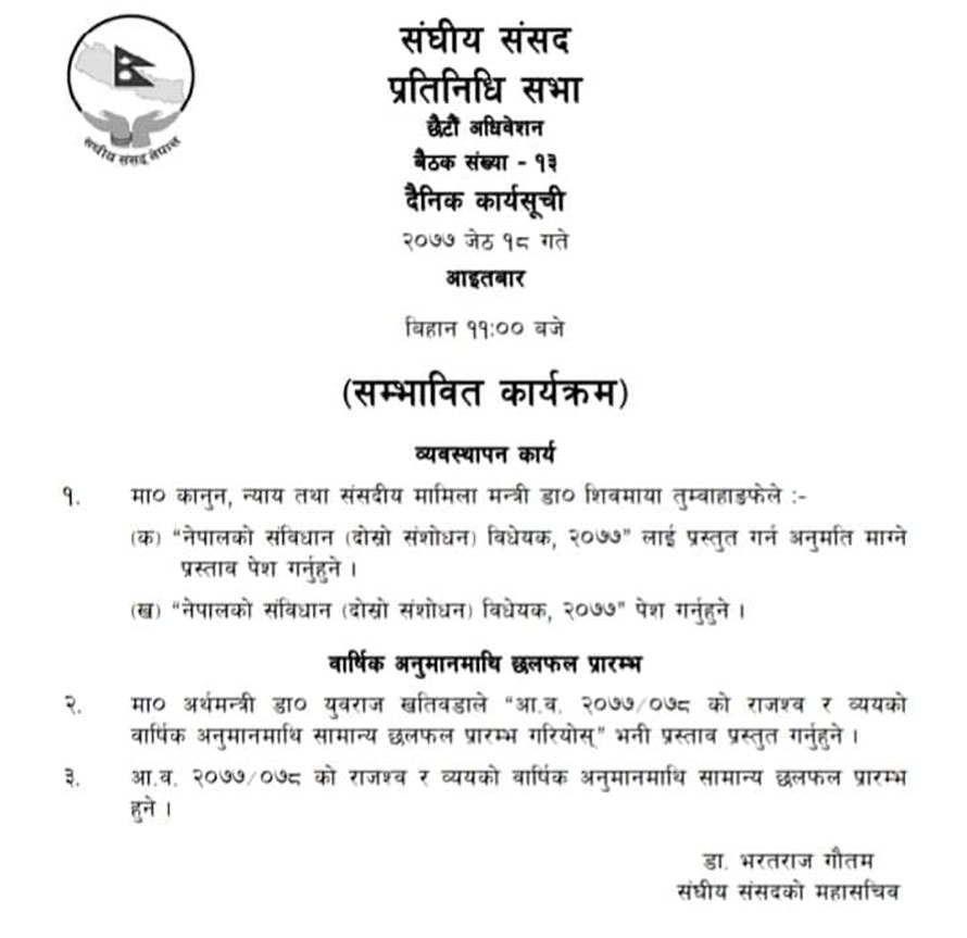प्रतिनिधिसभाको आजको बैठकमा सरकारले संविधान संशोधन विधेयक पेश गर्ने तयारी गरेको छ । कानुनमन्त्री डा. शिवमाया तुम्बाहाङफेले संविधान संशोधन विधेयक पेश गर्ने संसदको सम्भावित कार्यसूची रहेको जानकारी गराउनुभयो । केहि दिन अघि नेपालको कालापानी, लिम्पिराधुरा र लिपुलेग सहितको नयाँ नक्सा मन्त्रिपरिषदबाट स्वीकृत गरी सार्वजनिक समेत गरिसकेको नक्सालाई आधिकारिकता दिनको लागि नेपालको संबिधानमा समेत संशोधन गरी प्रशासनिक कामकाजमा ल्याउने सरकारको तयारी रहेको छ ।
