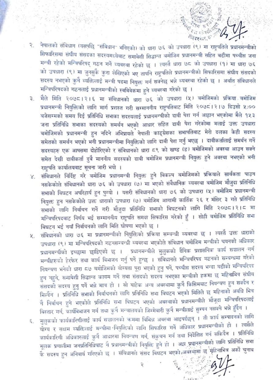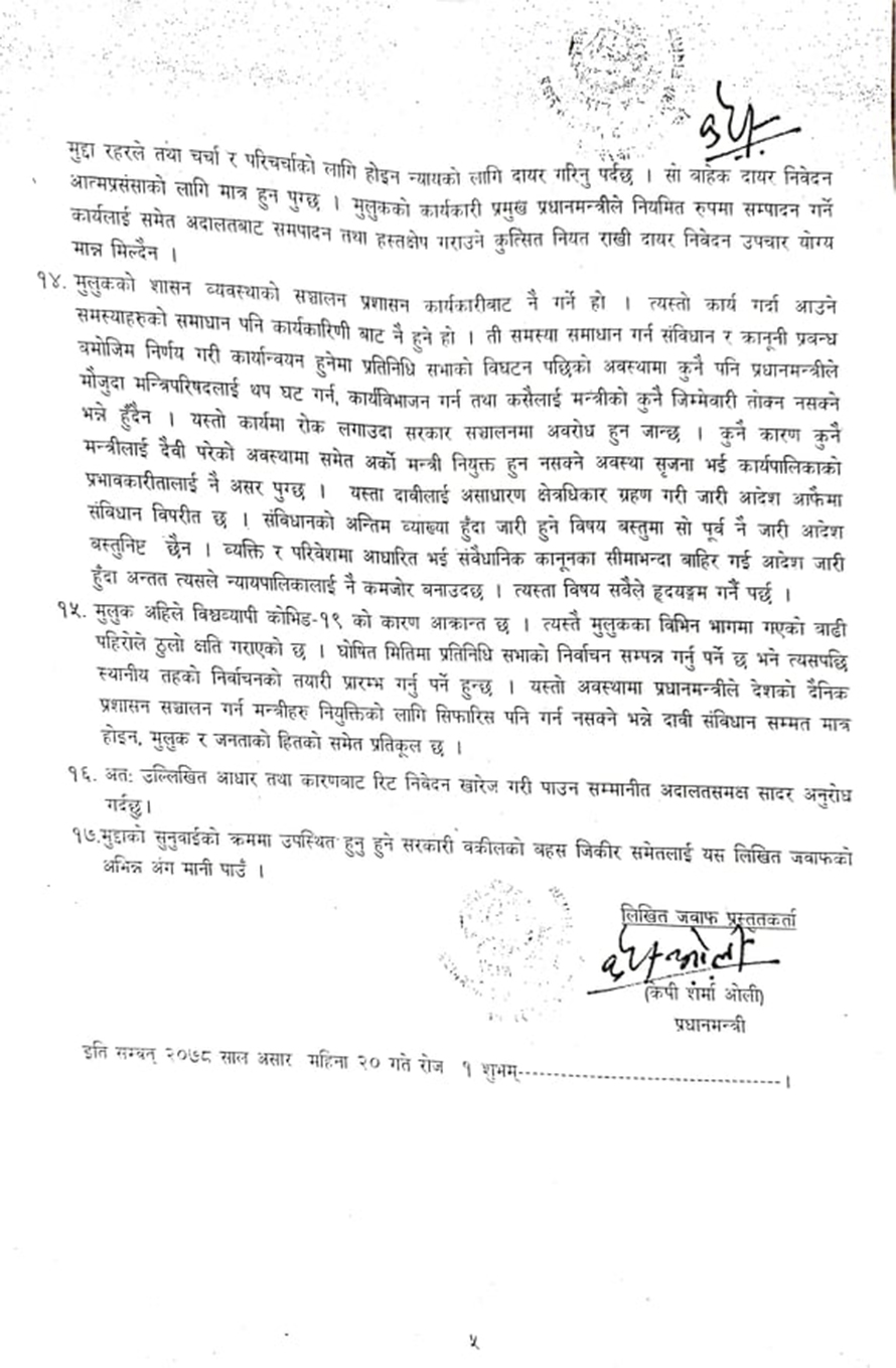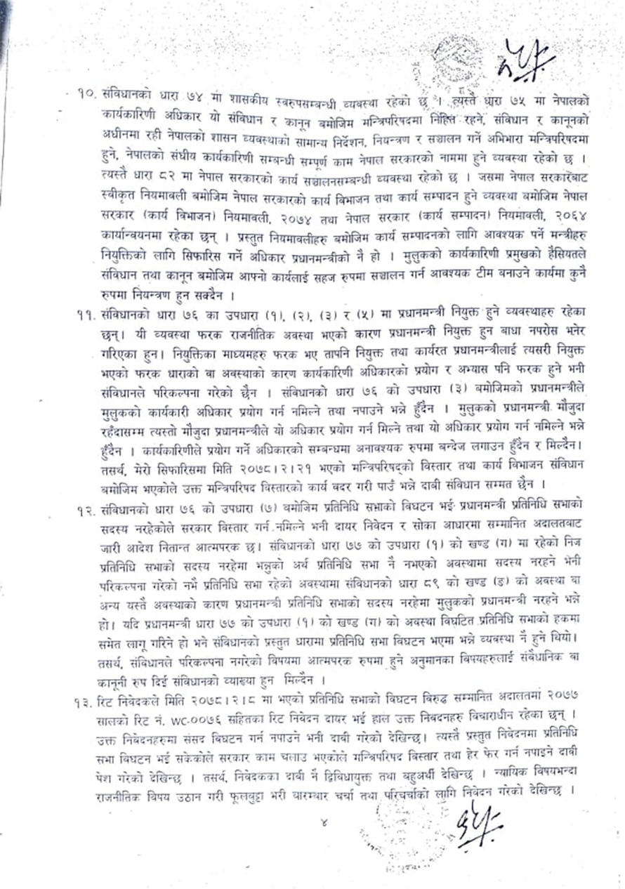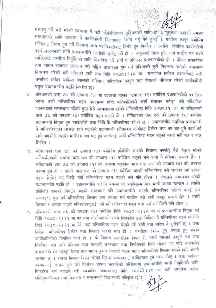 मन्त्रिपरिषद विस्तारसम्बन्धी मुद्दामा सर्वोच्च अदालतमा लिखित जवाफ पठाउँदै उनले कार्यपालिकाको प्रभावकारितामा नै असर पर्ने गरी सर्वोच्च अदालतले दिएको आदेश संविधान विपरीत भएको दावी गरेका हुन् ।