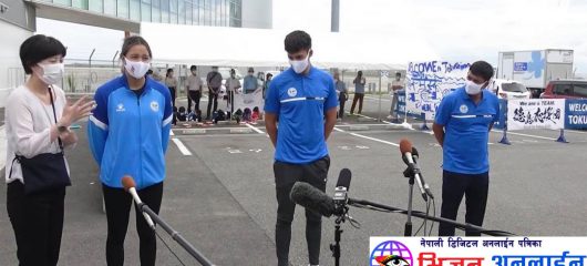 जापान, असार २४। टोकियोमा यहि जुलाई २३ बाट शुरु हुन गईरहेको गृष्मकालिन टोकियो ओलम्पिकमा सहभागिता हुन नेपाली खेलाडीहरु आज जापान आईपुगेका छन । विहिबार जापान आइपुगेका नेपाली खेलाडीहरुलाई भब्य स्वागत गरिएको छ । विहिबार तोकुसिमा प्रान्तमा पुगेका पौडीका गौरिका सिंह, अलेजेन्डर शाह ९एलेक्स० र पौडीका मुख्य प्रशिक्षक शंकर कार्कीलाई प्रान्तका पदाधिकारीहरुले भब्य स्वागत गरेका हुन् … Continue reading जापान टोकियो ओलम्पिकमा सहभागि हुन आइपुगेका नेपाली खेलाडीलाई भब्य स्वागत
