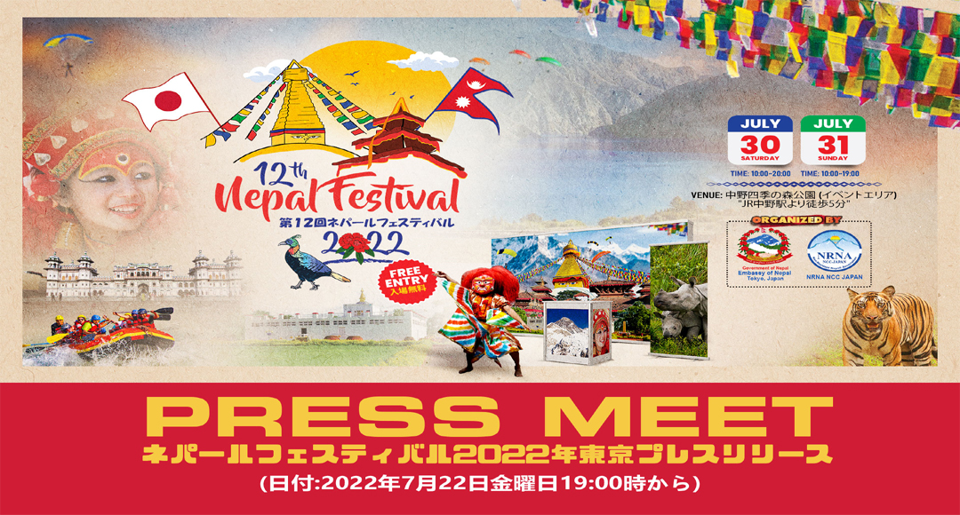जापानको टोकियोमा यहि जुलाई ३० र ३१ तारिख आयोजना हुने, १२ औँ नेपाल फेस्टिवल २०२२ को तयारी तथा आकर्षण लगायतका सम्पूर्ण जानकारीहरु सार्वजनिक गर्ने उदेश्य सहित आउँदो २२ तारिख बृहत पत्रकार सम्मेलन आयोजना गरिने भएको छ ।