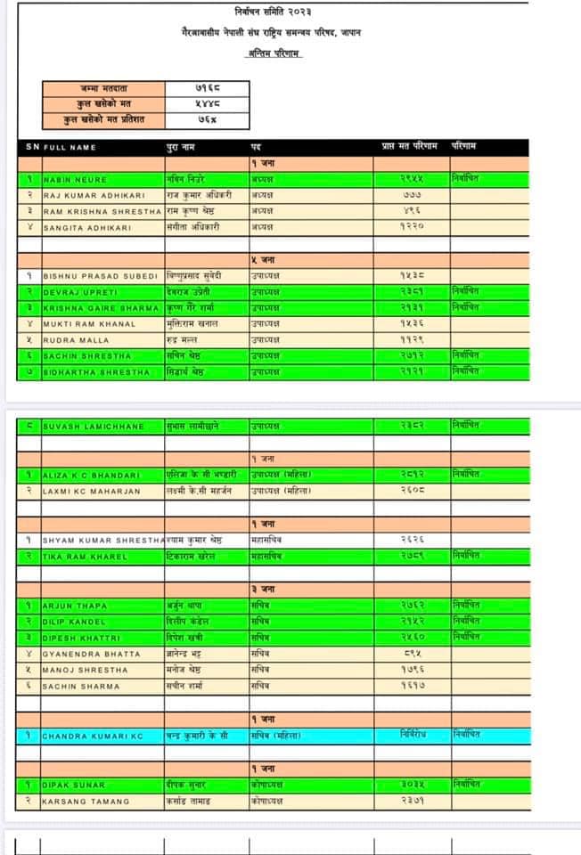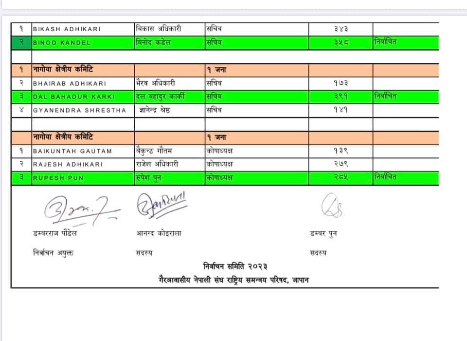 गैर आवासीय नेपाली संघ (एनआरएनए) जापानको आसन्न निर्वाचन २०२३–०२५ कार्यकालको लागि भएको निर्वाचन सम्पन्न भएको छ । आज बिहान १० बजेबाट शुरु भएको निर्वाचन बेलुकी ७ बजेसम्म संचालन भएको थियो । यस पटकको निर्वाचनमा एमआईएस भेरो सिस्टमबाट निर्वाचन गरिएको थियो । उक्त निर्वाचनबाट गैर आवासीय नेपाली संघ जापानको अध्यक्षमा नबिन निउरे अत्यधिक बहुमतका साथ निर्वाचित भएका छन् । उनले आफ्ना प्रतिद्धन्धिलाई हराउदै २९५५ मत सहित जित हासिल गरेका हुन्।