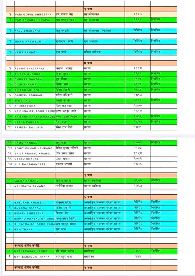 त्यसैगरि कोषाध्यक्ष पदमा दिपक सुनार, सहकोषाध्यक्षमा राम बहादुर थापा निर्वाचित भएका छन। महिला सह कोषाध्यक्षमा अन्जुभण्डारी निर्विरोध निर्वाचित भएकी थिइन । यसैगरि महिला संयोजकमा हेमा पाण्डे र युवा संयोजक पदमा मुक्तिराज रेग्मी निर्विरोध निर्विरोध निर्वाचित भएका छन् ।