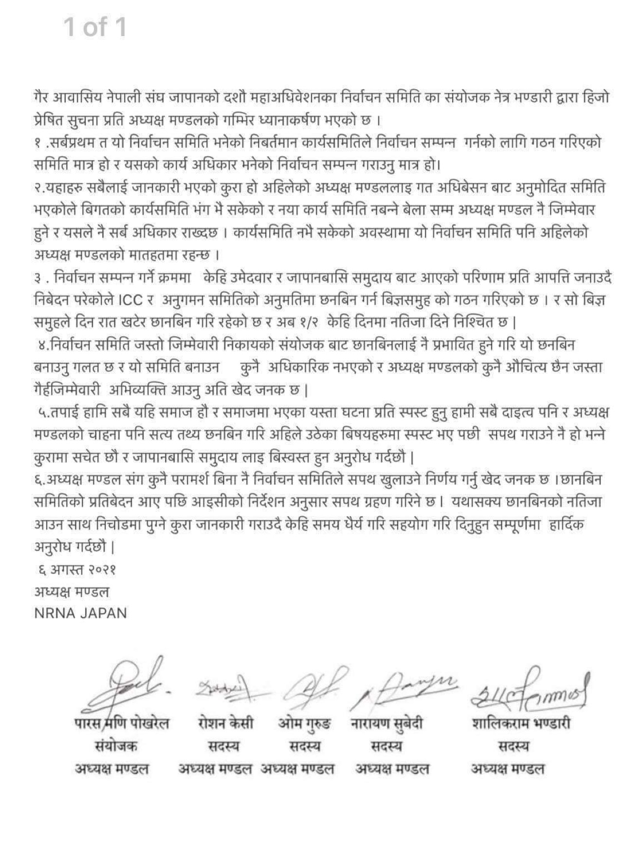 निर्वाचन सकिएको एक हप्ता बिति सक्दा पनि नवनिर्वाचित कार्यसमितिको सपथ हुन नसकेको एनआरएन जापानमा निर्वाचन समिति, अध्यक्ष मन्डल र निर्वाचनको विरुद्ध रहेका उम्मेद्वारका विच पत्र युद्ध चलिरहेको छ ।