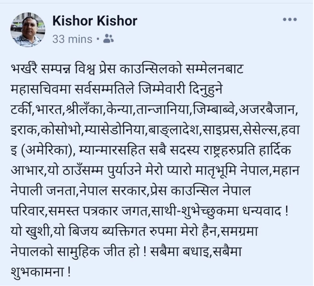 महासचितव चुनिएपछि श्रेष्ठले सबैलाई धन्यवाद दिएका छन् । ‘यो विजय व्यक्तिगत रुपमा मेरो मात्र होइन, समग्रमा नेपालको सामूहित जित हो,’ उनले लेखेका छन् ।