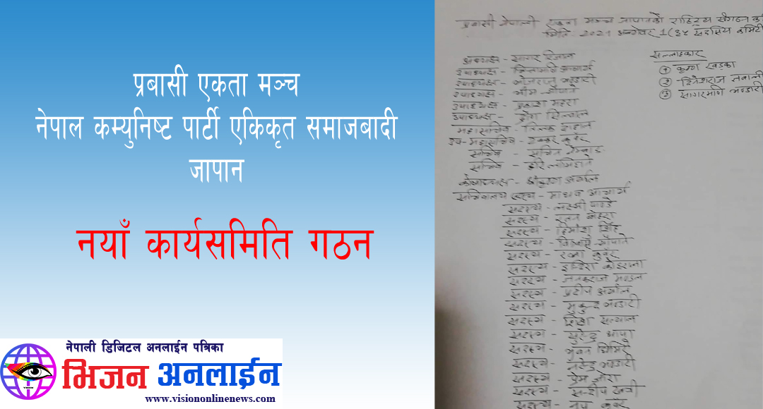 मिति २०२१ अक्टोबर १ तारिख नेकपा एकीकृत समाजबादी पार्टी सम्बद्ध जापानको राष्ट्रीय संगठन कमिटीको निर्माण तथा घोषणा कार्यक्रम पार्टी पोलिटब्युरो सदस्य तथा प्रबास इन्चार्ज श्रीप्रसाद साहको प्रमुख आतिथ्यतामा र प्रबासी नेपाली मन्च जापानका पूर्व अध्यक्ष कृष्ण खड्काको सभापतित्वमा सम्पन्न भएको छ । कार्यक्रममा प्रबासी नेपाली एकता मन्च अस्ट्रेलियाका अध्यक्ष राजन बस्नेत अतिथि हुनुहुन्थ्यो । प्रमुख अतिथि श्रीप्रसाद शाहले बर्तमान राजनैतिक परिस्थितिको बारेमा र प्रबासमा पार्टीको भूमिका सम्बन्धमा प्रकाश पार्दै नव निर्वाचित कमिटीलाई बधाई तथा शुभकामना दिनु भयो र कमिटीमा निर्वाचित पदाधिकारी तथा सदस्यहरुलाई सपथग्रहण समेत गराउनु भएको थियो।