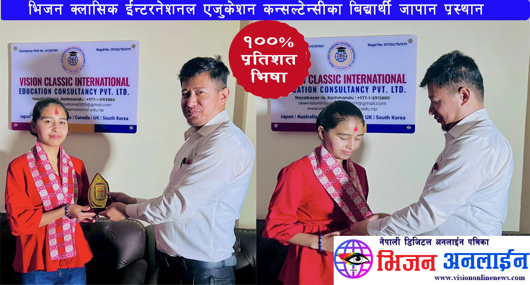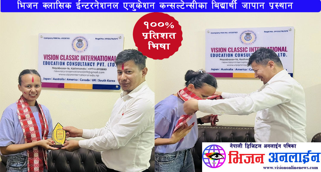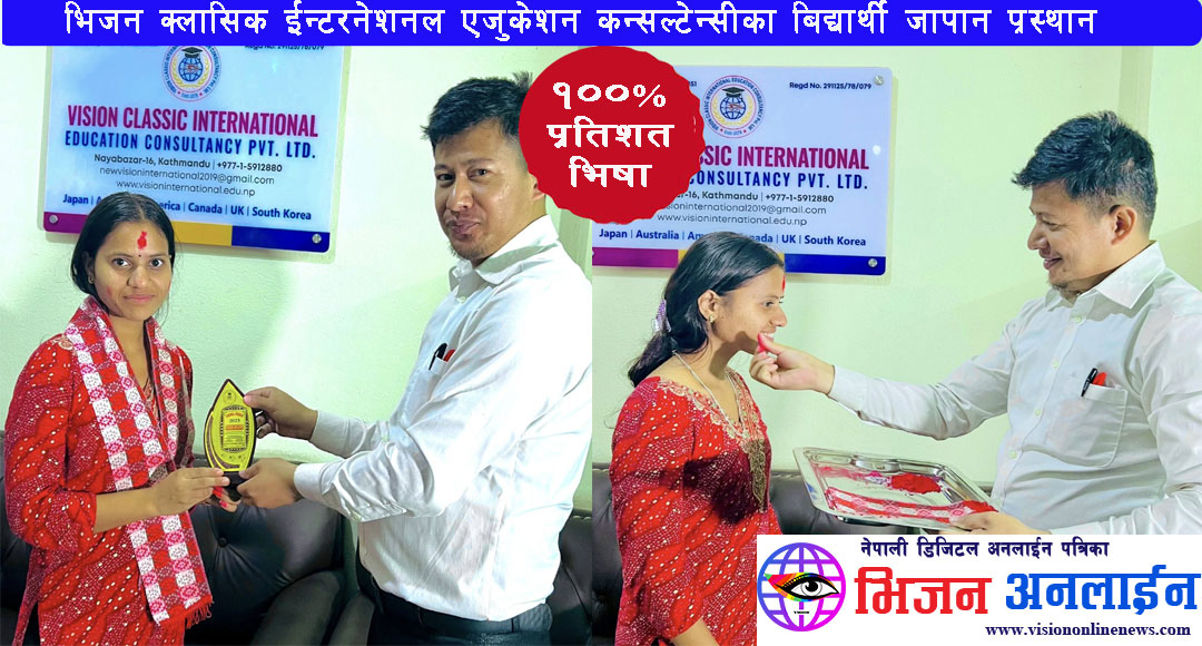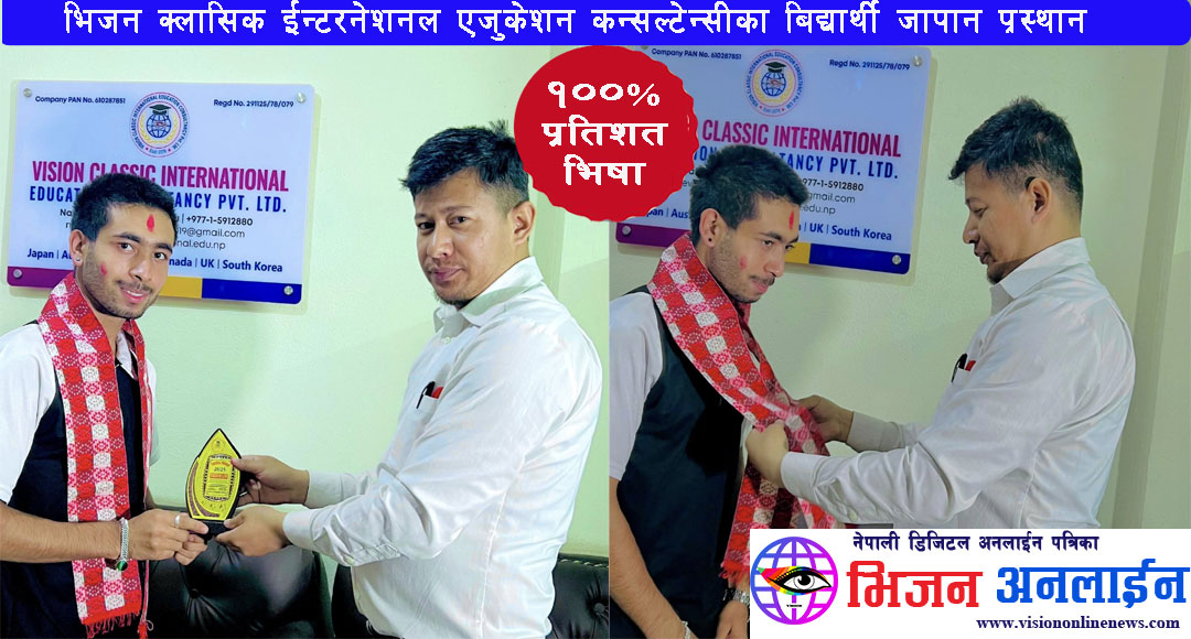 जापानमा उच्च शिक्षा अध्ययनका लागि भिजन क्लासिक ईन्टरनेशनल एजुकेशन कन्सल्टेन्सीबाट अप्लाई गरेका सम्पुर्ण शतप्रतिशत बिद्यार्थीले सिओई लेटर प्राप्त गरेका छन । उक्त कन्सल्टेन्सीबाट भाषा कक्षा अध्ययन गरेका र अन्य बिभिन्न कन्सल्टेन्सीका बिद्यार्थीहरुले समेत भिजन क्लासिक ईन्टरनेशनल एजुकेशन कन्सल्टेन्सीबाट अक्टोबर ईन्टेक २०२५ को लागि अप्लाई गरेकोमा सबैको सिओई र भिषा प्राप्त गर्न सफल भएका हुन । बिगत ४ बर्षदेखि काठमाण्डौँको सोह्रखुट्टेमा संचालनमा रहेको उक्त कन्सल्टेन्सी बिगतका बर्षका तुलनामा उत्कृष्ट नतिजा ल्याउन सफल भएको हो । बिगतका दिनमा सन्तोषजनक नतिजा ल्याउन नसकेकोमा उक्त कन्सल्टेन्सीका संचालक समेत रहेका जापानीज भाषा प्रशिक्षक सन्तमान शाक्य एक दशक लामो जापान बसाईलाई थाती राख्दै बिद्यार्थीहरुको भबिष्य कै लागि हाल नेपाल फर्किएर कन्सल्टेन्सी ब्यबसायमा नै आबद्ध हुनुहुन्छ । लामो समयको जापान अनुभवसँगै गुणस्तरीय शिक्षाको लागि उत्कृष्ट गन्तब्य रहेको भिजन क्लासिक ईन्टरनेशनल एजुकेशन कन्सल्टेन्सीको हाल किर्तिपुरको पाँगादोबाटोमा समेत ब्रान्च कार्यालय रहेको छ । लामो समय जापान बसेर बटुलेका अनुभबलाई ब्यबहारमा लागु गर्दै बिद्यार्थीको भबिष्यमा दत्तचित्त भएर लागेका संचालक तथा जापानिज भाषा प्रशिक्षक समेत रहेका सन्तमान शाक्यले नेपाल आएको ६ महिनामा नै शतप्रतिशत रिजल्ट ल्याउन सफल भएका छन ।