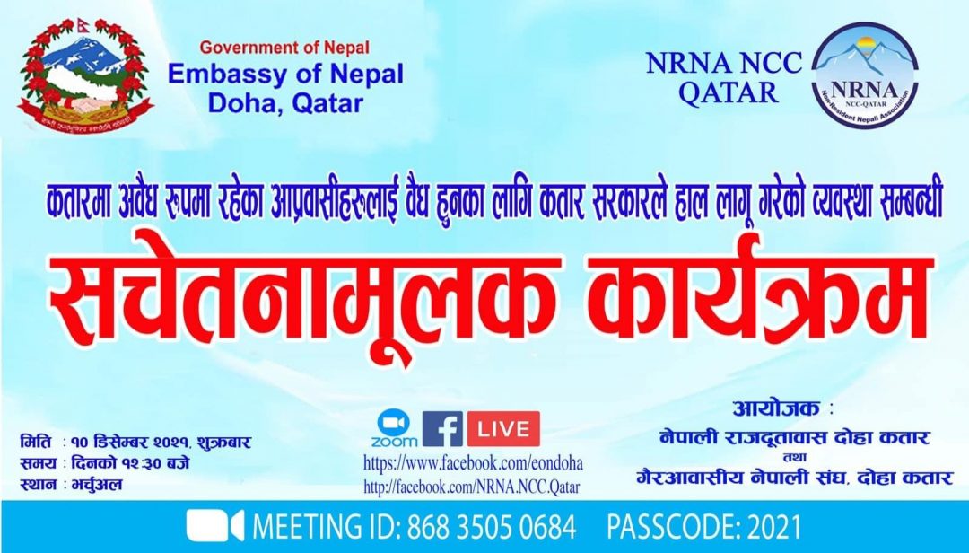 उपरोक्त सम्बन्धमा नेपाली राजदुतावास कतार र गैरआवासीय नेपाली संघ, राष्ट्रिय समन्वय परिषद कतारको सयुक्त आयोजनामा कतारमा अबैध रुपमा रहेका आप्रवासी कामदारहरुलाई बैध हुनका लागि कतार सरकारले हाल लागू गरेको ब्यवस्था सम्बन्धी नेपाली समुदायको लागि सचेतना कार्यक्रम तल उल्लेखित मिति र समयमा भर्चुअल अनलाईन मार्फत तय गरिएको जानकारी गराउदै सहभागिताको लागि हार्दिक अनुरोध गर्दछौ।