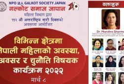 गलकोट समाज जापानद्वारा अन्तराष्ट्रिय नारी दिवशको अवसरमा नेपाली महिलाको अवस्था अवसर र चुनौति विषयक अन्तरक्रिया कार्यक्रम आयोजना
