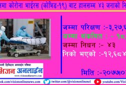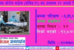 काठमांडौ, साउन ३ । पछिल्लो २४ घण्टामा शनिबार कोरोना भाइरसका ५७ जना संक्रमित थपिएका छन्। स्वास्थ्य तथा जनसंख्या मन्त्रालयका प्रवक्ता डाक्टर जागेश्वर गौतमले दिएको जानकारी अनुसार विगत २४ घण्टामा देशभरका २७ वटा प्रयोगशालामा तीन हजार तीन सय ३१ जनाको पिसिआर विधिबाट परीक्षण गर्दा जम्मा ५७ जनामा कोरोना देखिएको हो।...