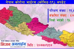 काठमाडौं, बैशाख १ । सोमबार कैलालीमा र रौतहटमा गरी २ जनामा कोरोना संक्रमण पोजेटिभ भेटिएको छ । उनिहरुमा पोजेटिभ भेटिए पछि संक्रमित हुनेकोसंख्या १४ पुगेको हो । स्वास्थ्य तथा जनसंख्या मन्त्रालयको नियमित पत्रकार सम्मेलनमा मन्त्रालयका प्रवक्ता डा। विकास देवकोटाले जानकारी दिए । var bannersnack_embed = {"hash...
