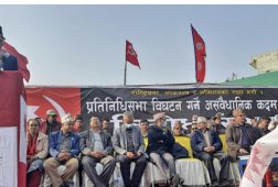 काठमाडौं, माघ ९। नेपाल कम्युनिस्ट पार्टी (नेकपा)ले आज काठमाडौंमा शक्ति प्रदर्शन सहितको बिशाल जनसभा सम्पन्न गरेको छ । प्रधानमन्त्री केपी शर्मा ओलीको संसद् विघटनको कदमविरुद्ध पुष्पकमल दाहाल ‘प्रचण्ड’ र माधवकुमार नेपाल समूहले विरोध प्रदर्शन गरेको हो । काठमाडौं उपत्यकाकेन्द्रित बिशाल जनसभाको आयोजना गरिएको हो ...
