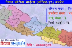 काठमाडौं, जेठ १९ । नेपालमा २४ घण्टामा थप २२६ जनामा कोरोना संक्रमणको पुष्टि भएको छ । यो संगै कुल संक्रमितको संख्या १७९८ जना पुगेको छ।स्वास्थ्य तथा जनसंख्या मन्त्रालयले सोमबार आयोजना गरेको नियमित मिडिया ब्रिफिङमा मन्त्रालयका प्रवक्ता डा. विकास देवकोटाले थप २२६ जनामा संक्रमण भएको जानकारी दिए । संक्रमित हुने...