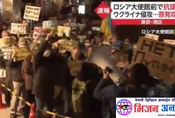 जापानको टोकियो स्थित रसियन राजदुताबास अगाडी युक्रेन समर्थकहरुको बिरोध प्रदर्शन युद्ध रोक्न दबाब