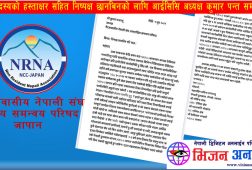 बहुमत सदस्यको हस्ताक्षर सहित एनआरएनए जापानको आर्थिक अनियमितताको निष्पक्ष छानबिन र अध्यक्ष भण्डारीको राजिनामा माग