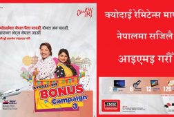 जापान, फागुन २२ । जापानबाट सुलभ, सुरक्षित अनी विश्वसनिय रेमिट्यान्स सेवा प्रदान गर्दै आइरहेको क्योदाइ रेमिट्यान्स आइएमइले अङ्रेजी नयाँ साल २०२० को शुरुवात सँगै नयाँ क्याम्पियन “बोनस पोइन्ट क्याम्पियन-३” शुरुवात गरेको छ । क्योउदाईबाट नेपाल पैसा पठाऔँ, बोनस अंक बढाऔँ, आफन्त भेट्न नेपाल जाऔँ भन्ने मुल नारा सहि...