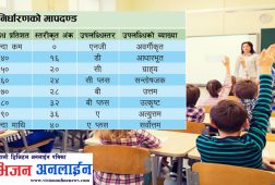 काठमाडौँ, पुस १२ । विद्यालय तह (कक्षा १ देखि १२ सम्म) का कुनै पनि विषयको परीक्षामा न्यूनतम ३५ प्रतिशत अंक प्राप्त नगरे माथिल्लो कक्षामा पढ्न नपाइने भएको छ । शिक्षा मन्त्रालयले विद्यालय शिक्षाको लेटर ग्रेडिङ निर्देशिका २०७८ जारी गर्दै यस्तो मापदण्ड तय गरेको हो । ग्रेडिङ्ग सिस्टममा बिद्यार्थी र अभिभाबकमा अन्यौलता...