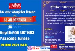 जापान, जेठ २७ । जापानको फ़ुकुओकामा रहेको नेपालीहरुको साझा र पुरानो संस्था फ़ुकुओका नेपाल सोसाईटीको गौरबमय २६ औँ अधिबेशन यहि जुन १९ तारिक हुने भएको छ। प्रमुख अतिथि राष्ट्रिय सभाका अध्यक्ष गणेश प्रसाद तिम्सिनासँगै बिशिष्ठ व्यक्तिहरुको सहभागी हुने कार्यक्रम रहेको अध्यक्ष शिब शर्माले जानकारी गराउनु भयो। १९९...