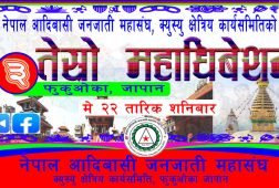 जापान, बैशाख २६ । नेपाल आदिबासी जनजाती महासंघ, क्युस्यु क्षेत्रिय कार्यसमिति फुकुओका, जापानको तेस्रो महाधिबेशन यहि मे महिनाको २२ तारिक शनिबार गर्ने भएको छ । क्युस्यु क्षेत्रिय कार्यसमितिको हिजो बसेको कार्यसमितिको बैठकबाट मे २२ तारिक शनिबार जुम भर्चुअल माध्यमबाट गर्ने निर्णय गरेको अध्यक्ष भिम बहादुर गुरुङ्ग...