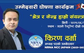 एनआरएनए जापानको अध्यक्ष पदमा क्युस्युबाट किरण वर्माको उम्मेदवारी घोषणा